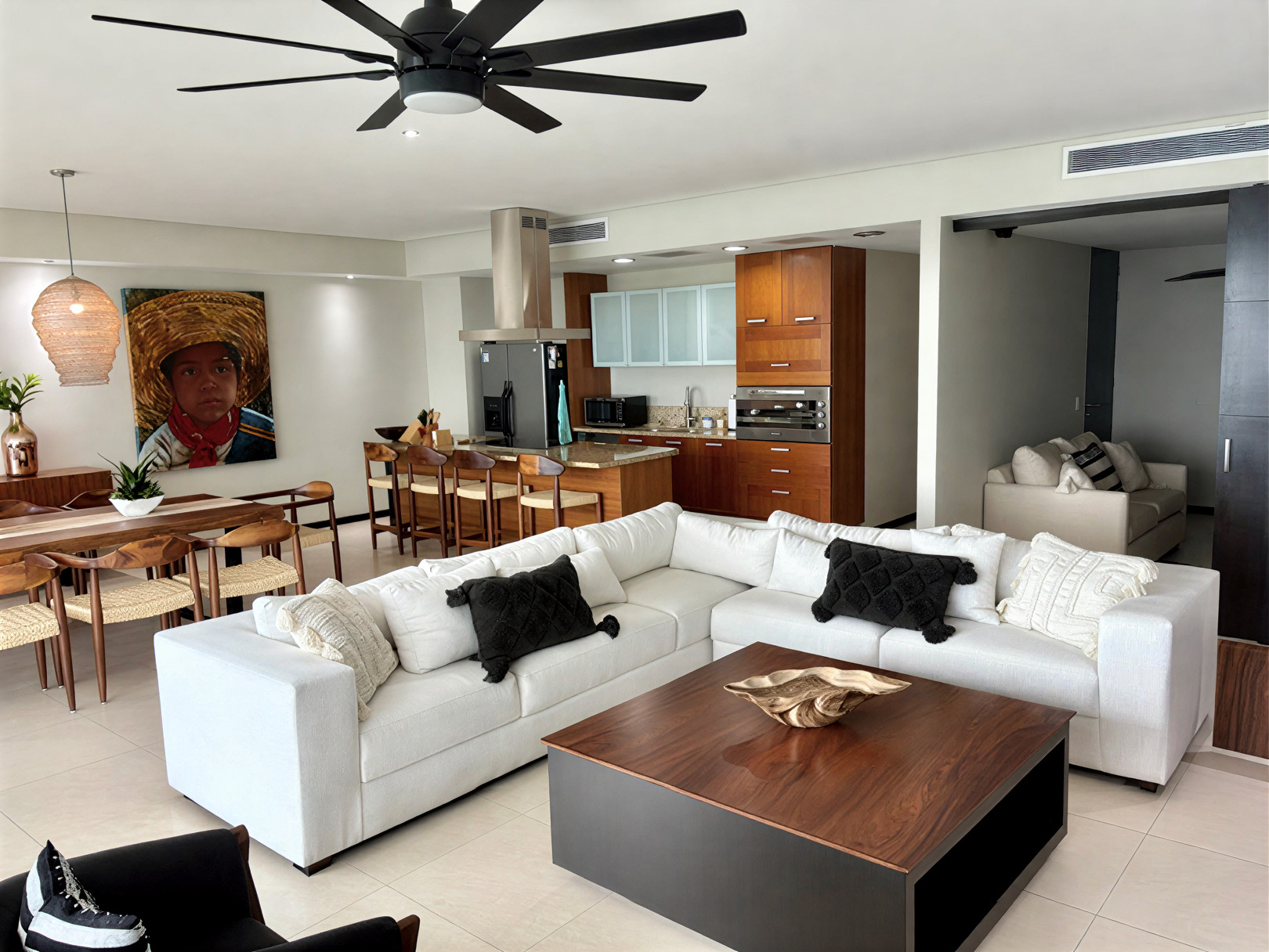 Step into 214 m² of total living space, where open interiors blend seamlessly with outdoor living. The expansive layout features bright living and dining areas that open directly onto a private terrace with breathtaking ocean views. As a result, the residence feels airy, elegant, and deeply connected to the Pacific.